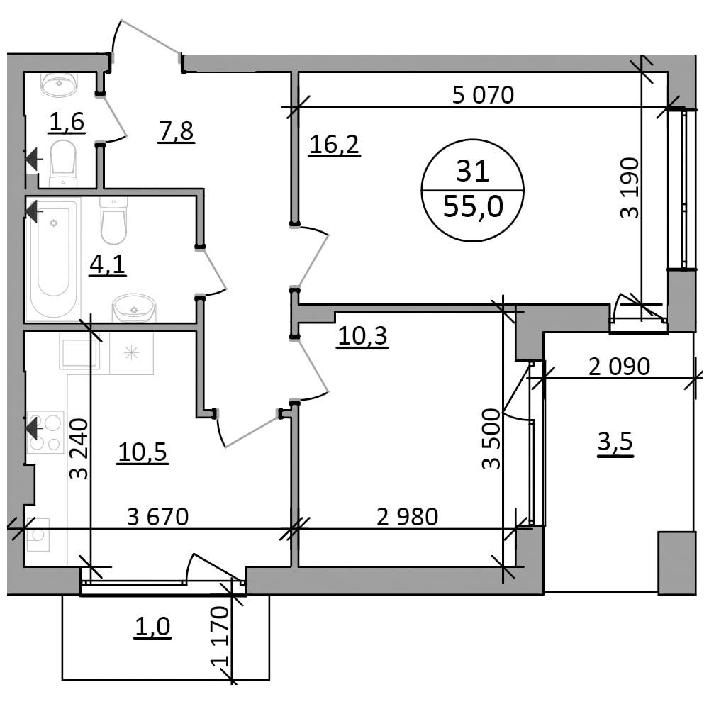 • Общая площадь 55 м2