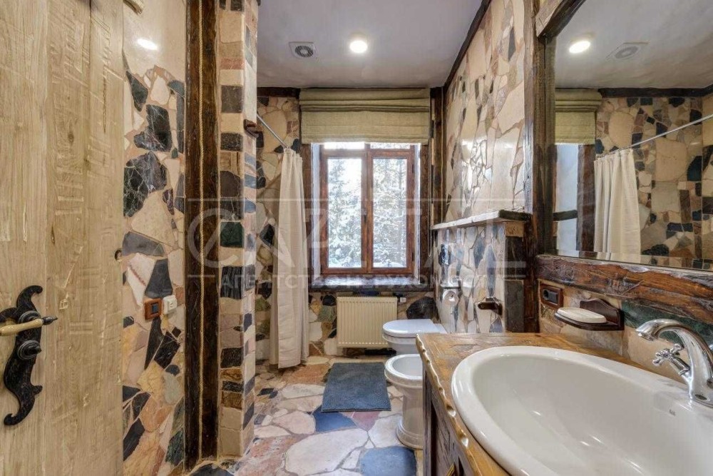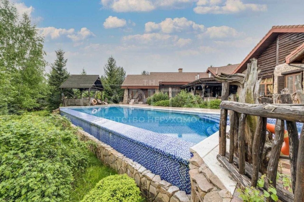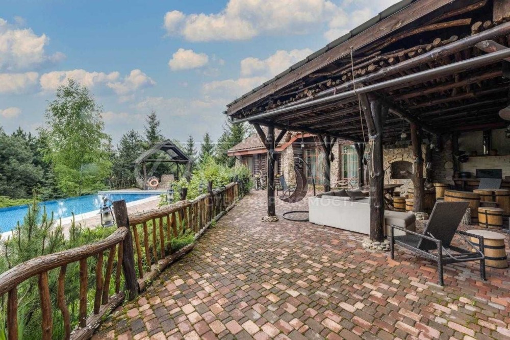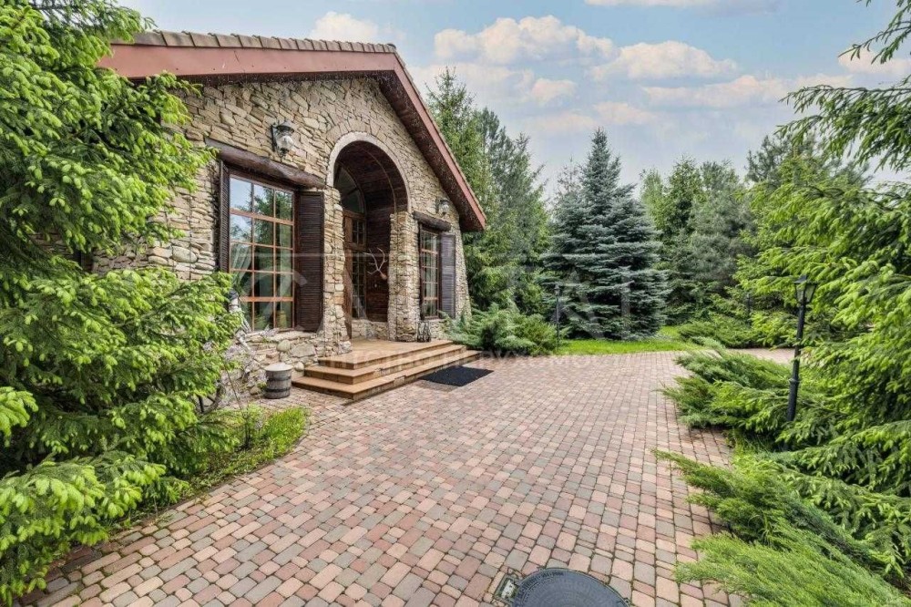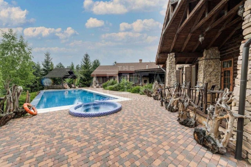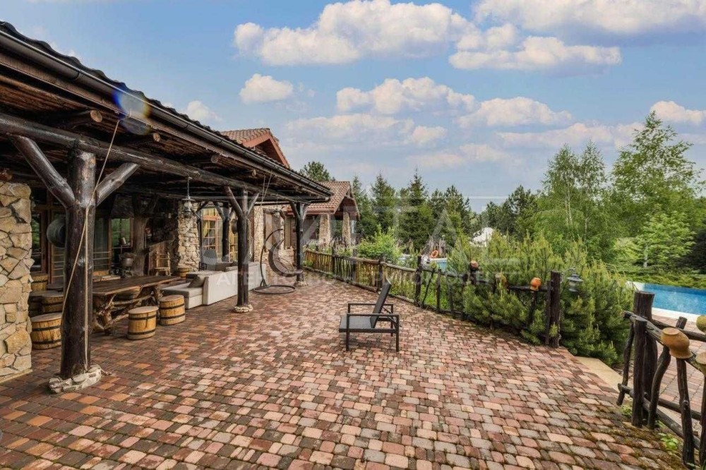 Основний будинок – 555 м2, 4 спальні з гардеробними та з/в, кабінет, спортзал, кухня, їдальня, вітальня з каміном, обідня зона з терасою. Будинок розташований в один рівень.