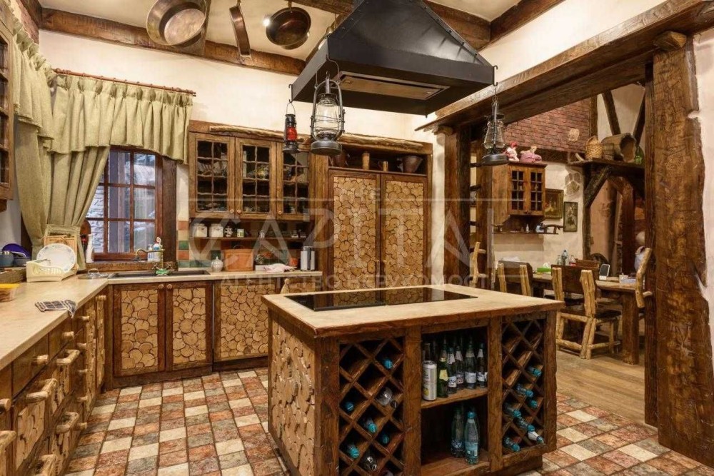 Вітальня-утворює великий відкритий простір, де немає стель. Дерев'яні балки окреслюють стельовий простір і підкреслюють сільський стиль. Грубі люстри підвішені на довгих ланцюгах.
