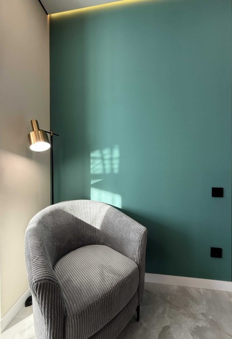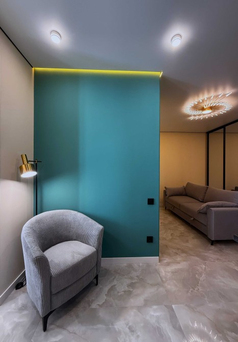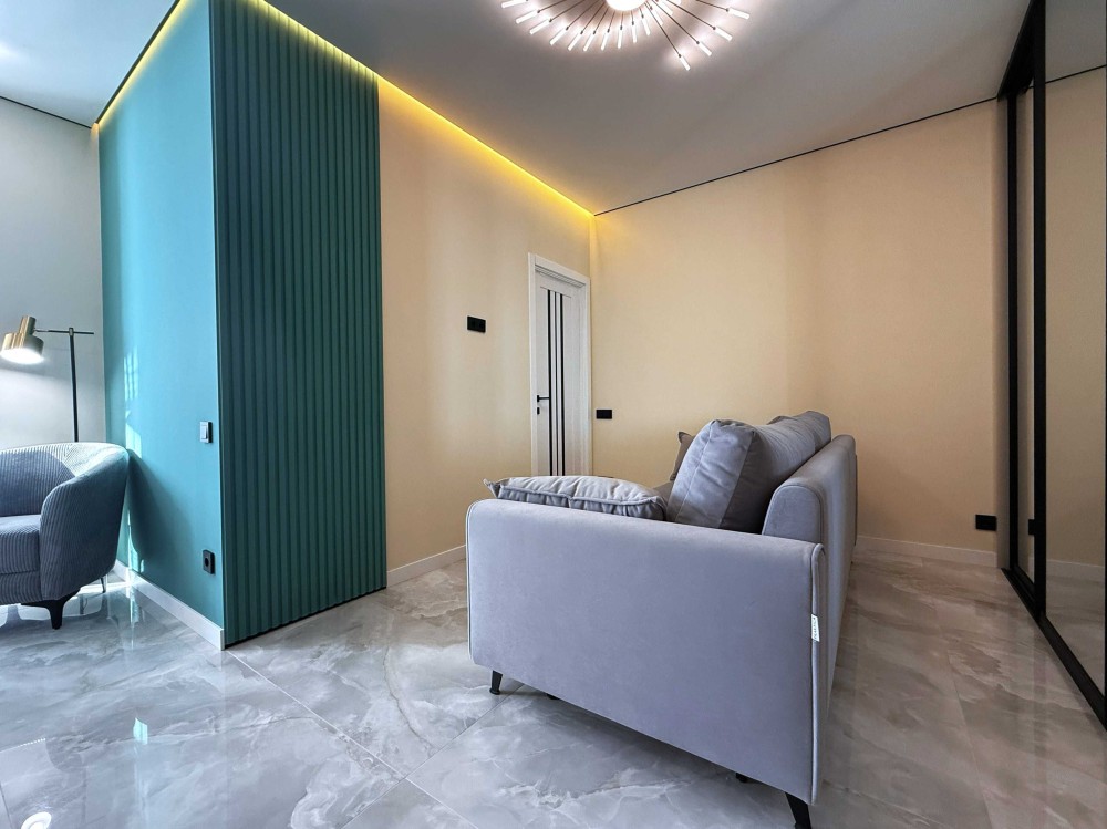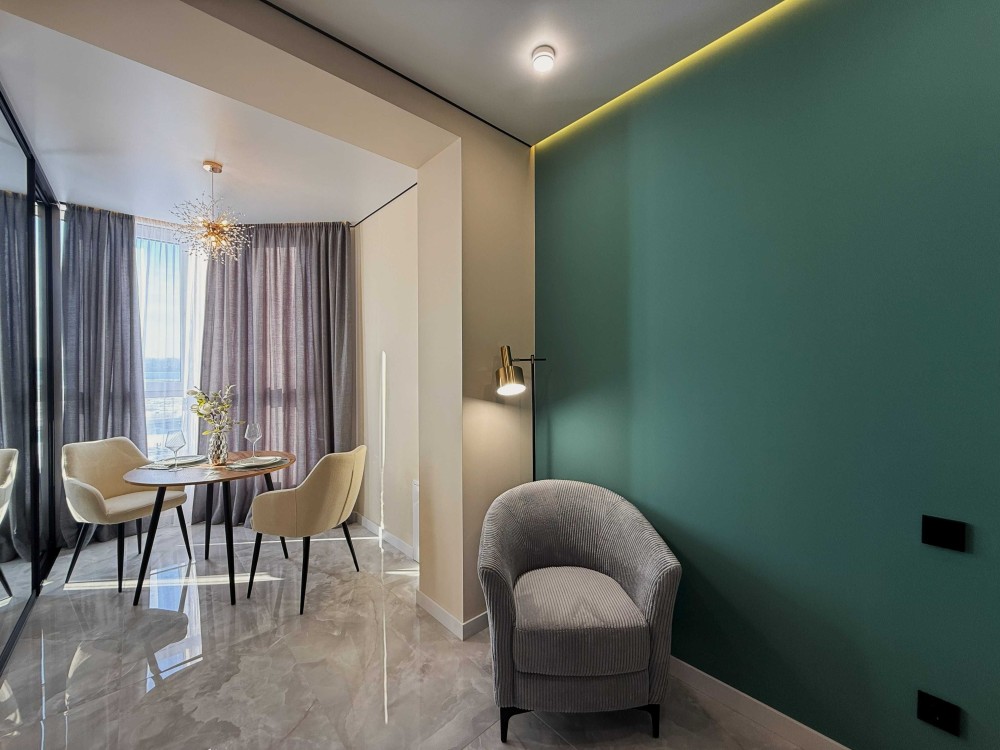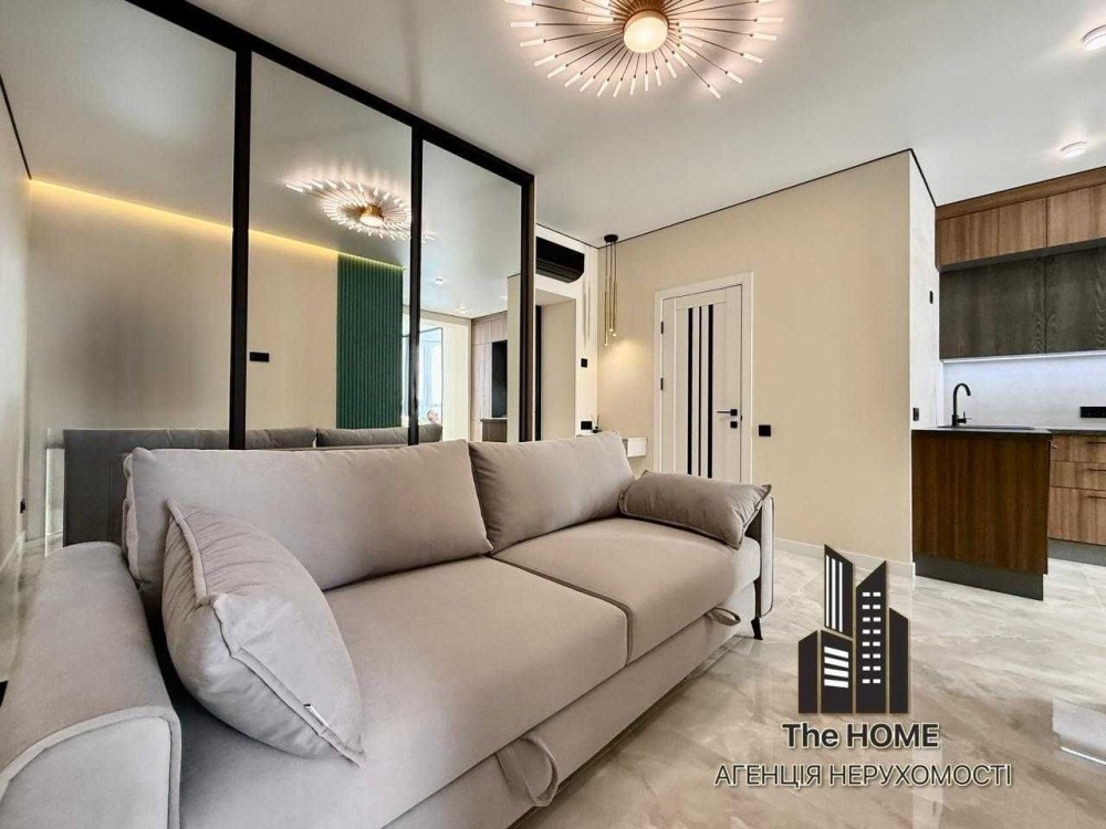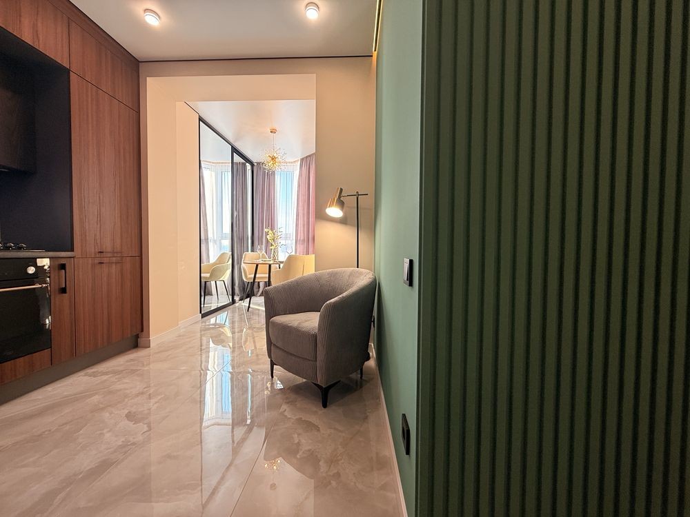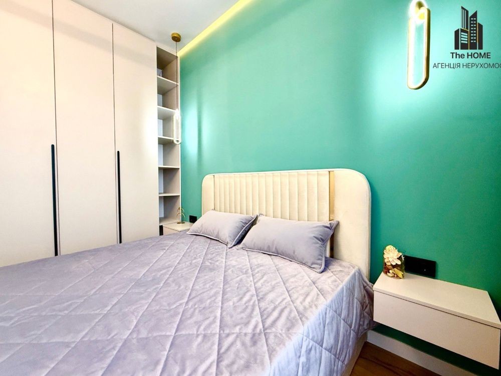 Пропонується до продажу сучасна 1-кімнатна квартира з дизайнерським ремонтом у вишуканих зелено-золотих акцентах. Інтер’єр поєднує елегантність, затишок та актуальні тренди.