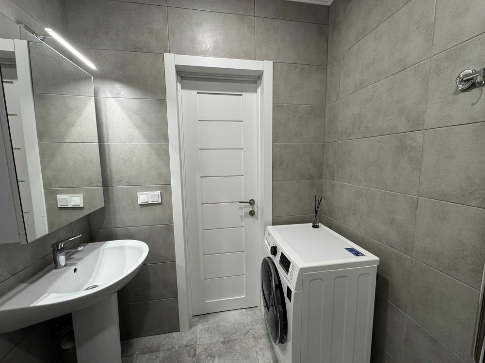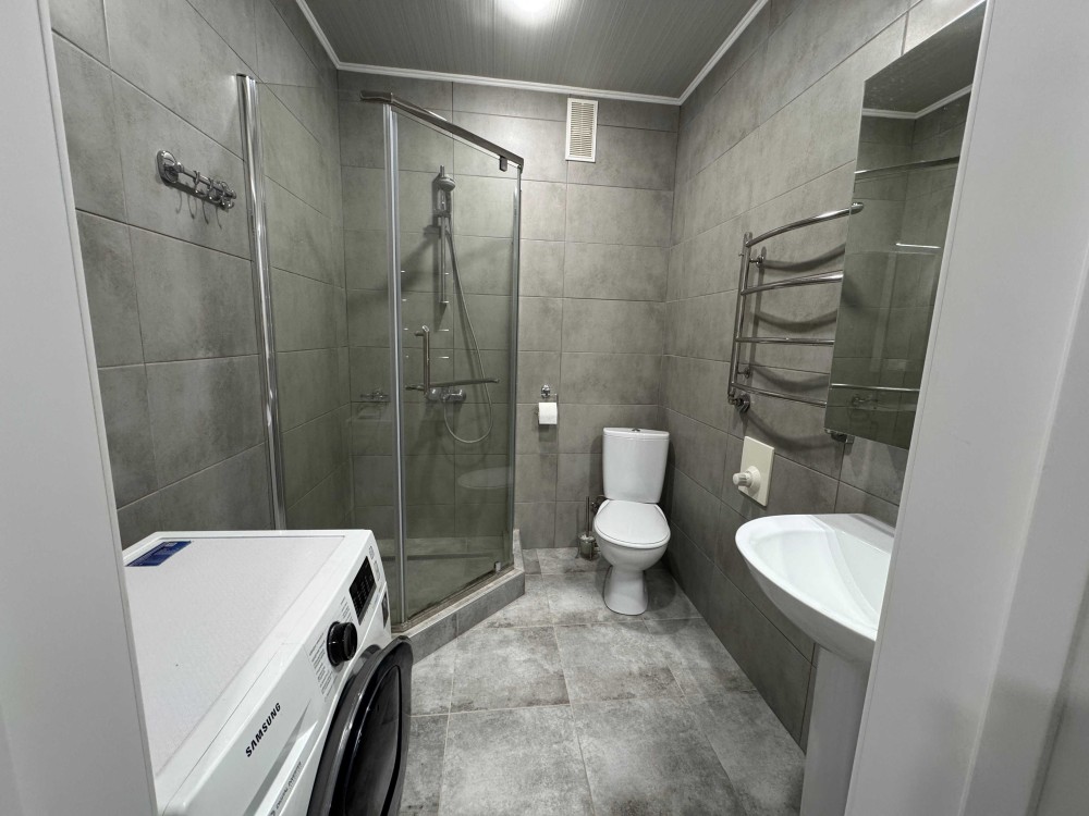 Суміжний санвузол виконаний у сучасному мінімалістичному стилі, з пральною машиною та душовою кабіною.