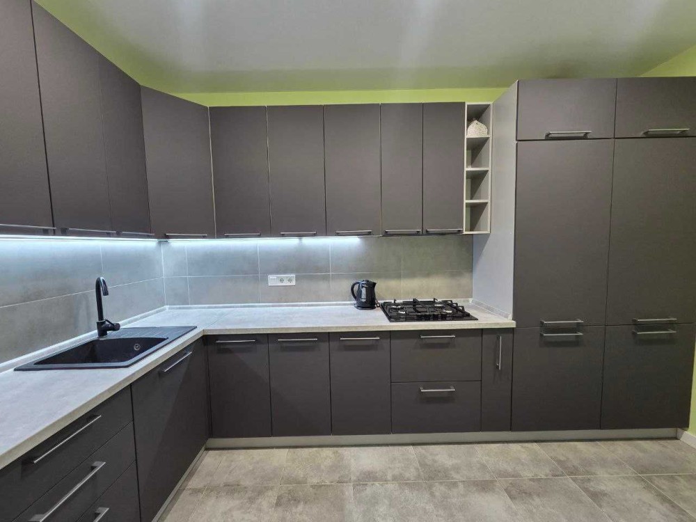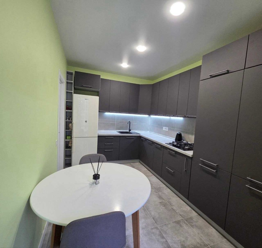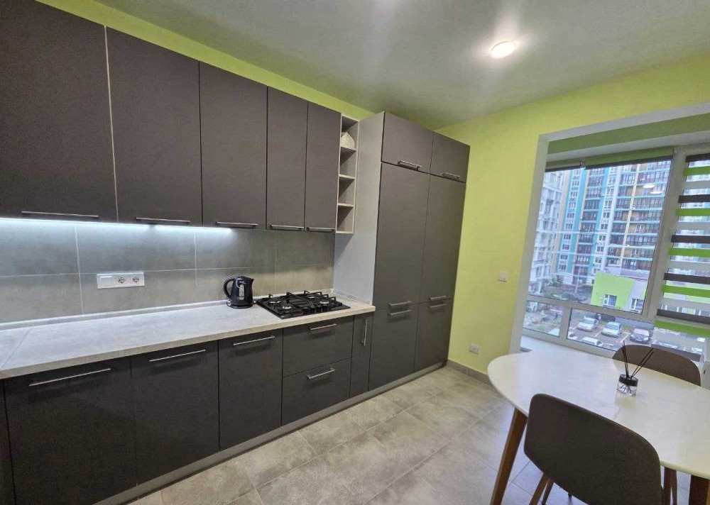 Кухня вирізняється сучасним дизайном у стриманих сіро-графітових тонах. Велика кутова кухня створює зручний робочий простір, а численні шафи дозволяють організувати зберігання так, щоб усе було під рукою. Сучасна техніка й продумане освітлення формують атмосферу затишку та комфорту.А доповненням кухні – є її простора лоджія.