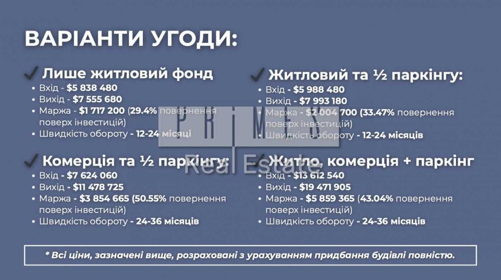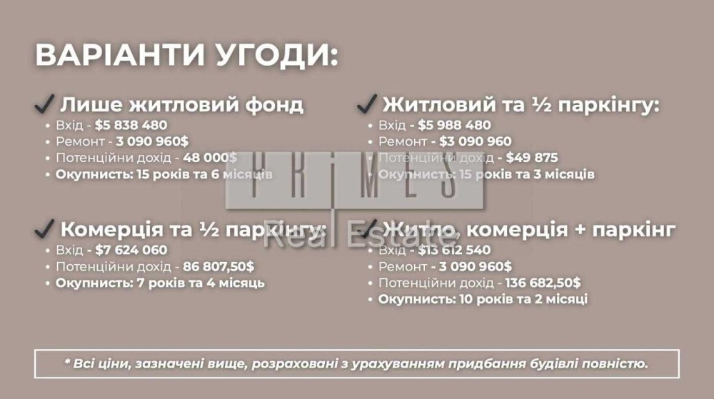 3 сценарії інвестування Mixed-use (житло + комерція + паркінг)