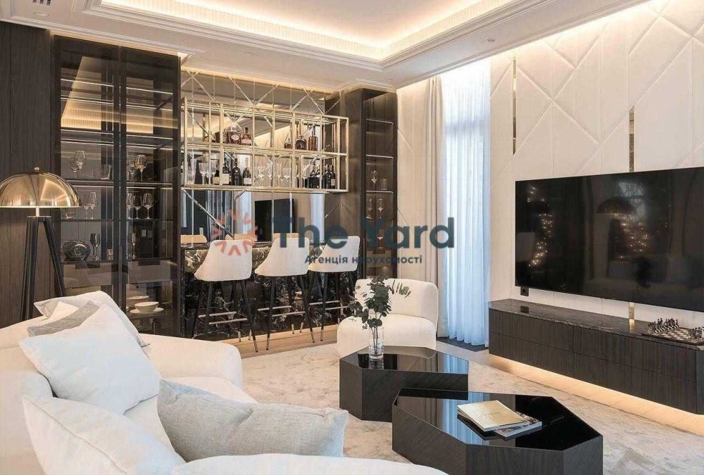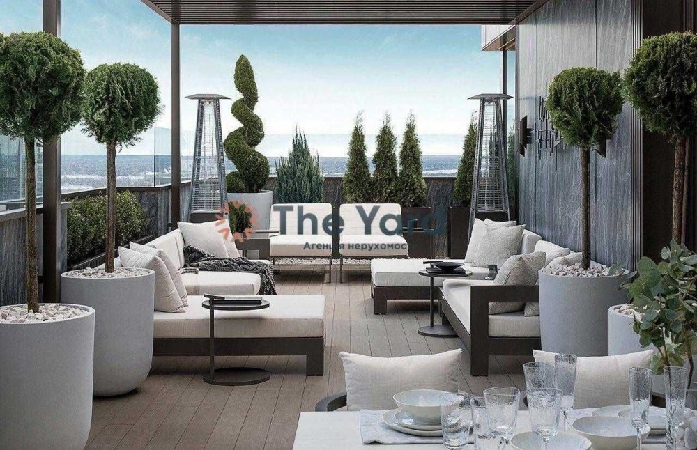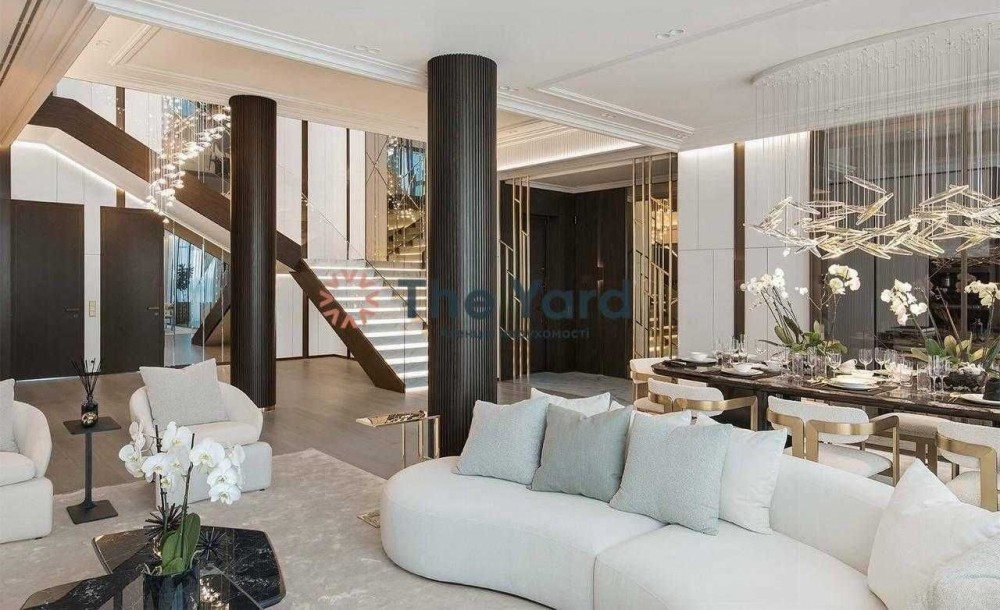 До вашої уваги пропонується пентхаус, розташований за адресою: вул. Драгомирова, 15-А. Дворівневий, 16–17 поверхи, загальна площа квартири — 400 м², житлова площа — 290 м². По периметру квартири розташована тераса з рослинами та меблями.