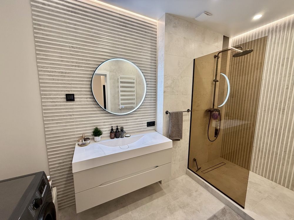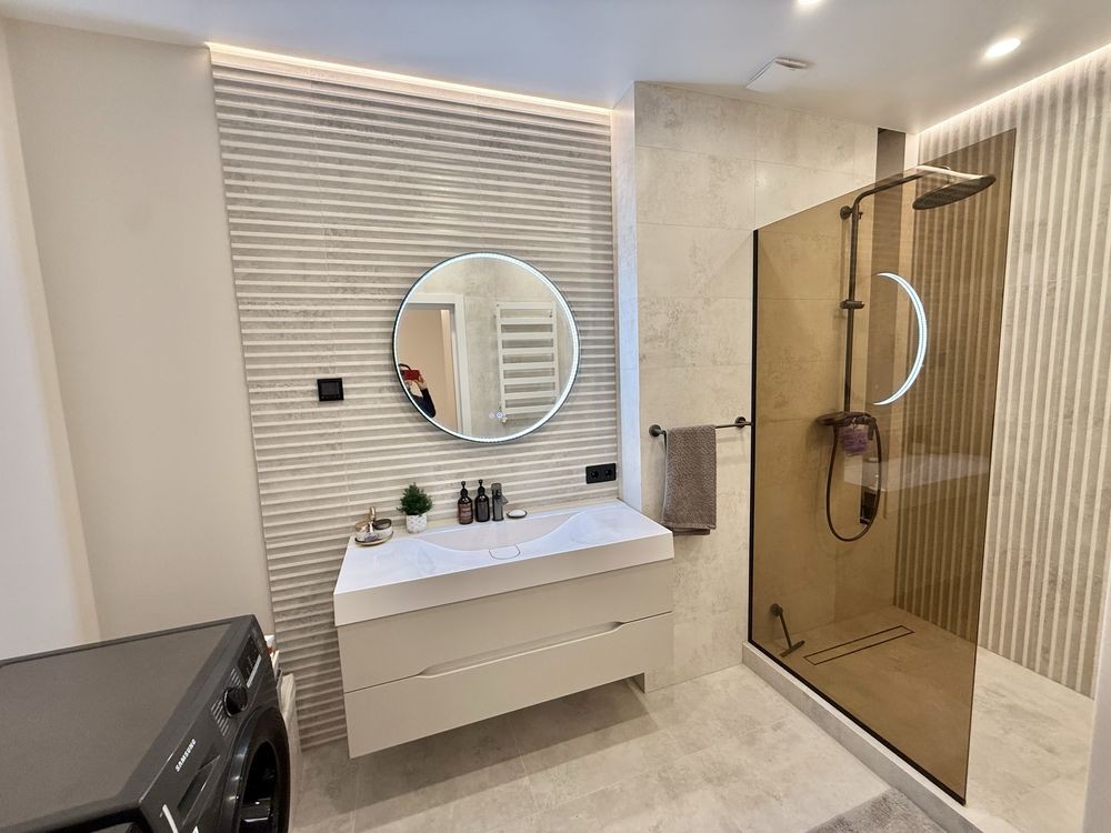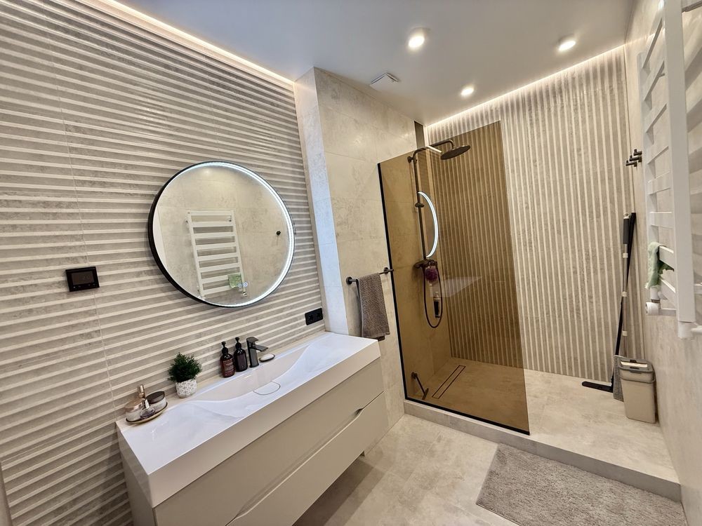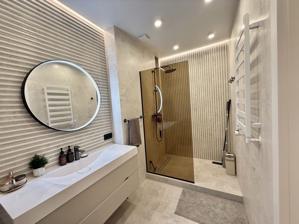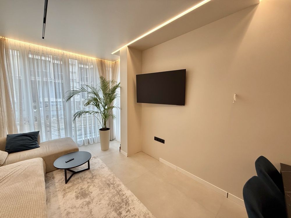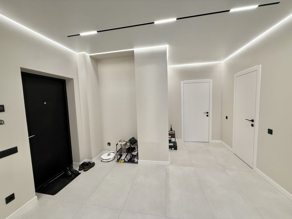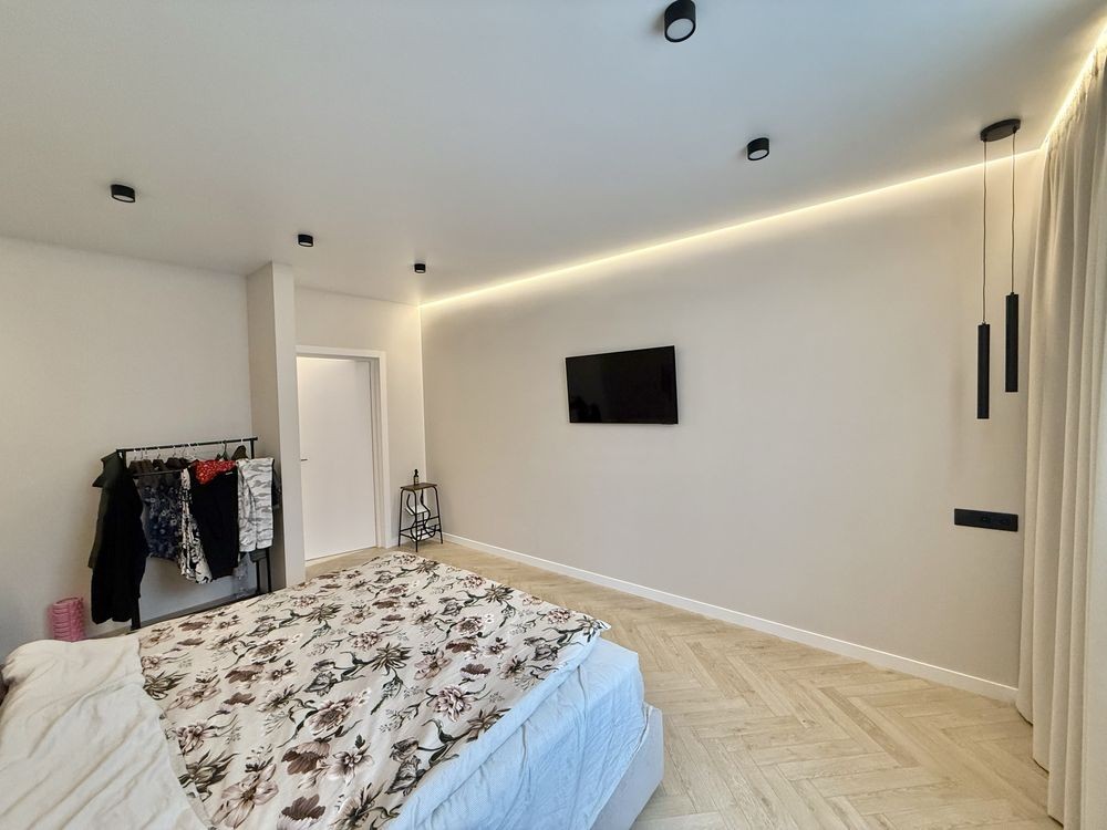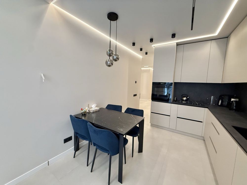 •В квартирі зроблений дизайнерський ремонт з дорогих матеріалів. Бельгійський паркет, кухонні меблі з HPL стільницею та контурна підсвітка говорять про те, що ремонт робився для себе, не для продажу