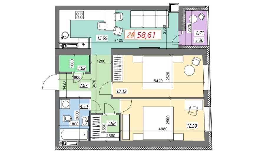 Площа - 58,61 м² — продумане, сучасне планування, де кожен метр працює на ваш комфорт.