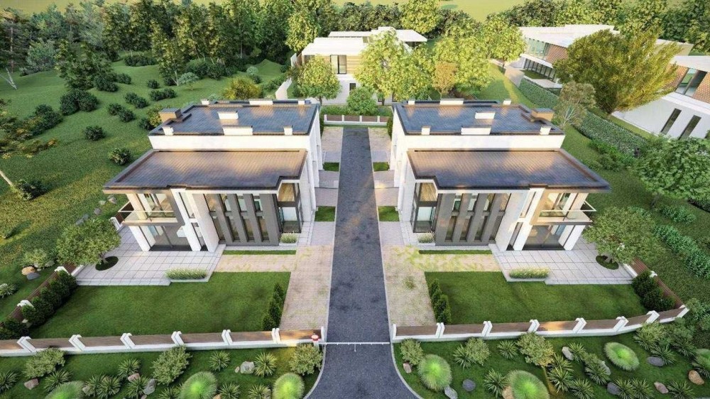 Двоповерхові спарені котеджі з великими, панорамними вікнами.
