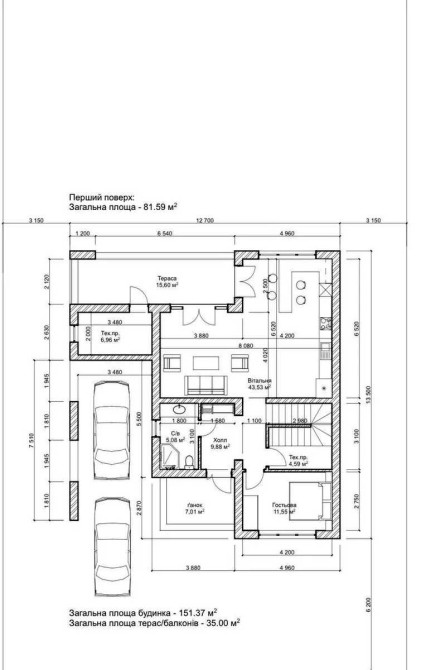 Велика кухня-вітальня, гостьова кімната, санвузол та тех. кімната