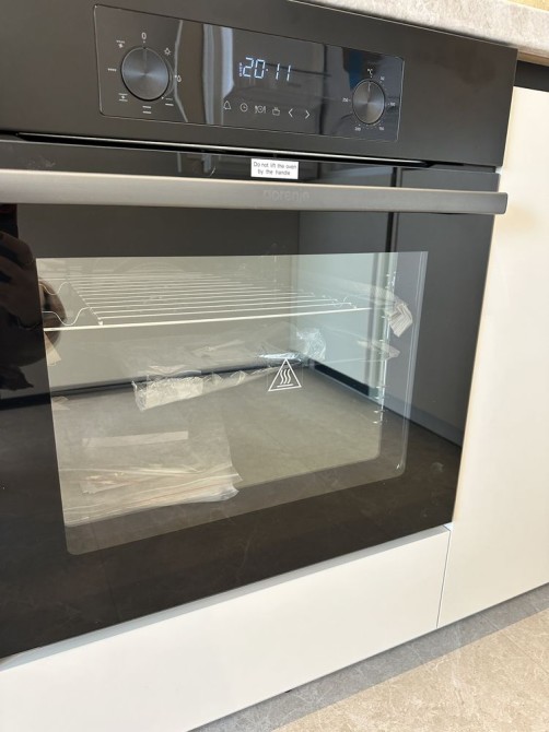 • Кухня: сіра, з вбудованим холодильником і технікою Gorenje (індукційна поверхня, духовка, витяжка), стильна підсвітка.