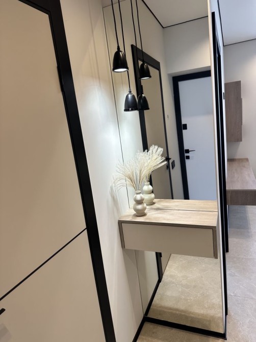 • Передпокій: містка шафа, велике дзеркало, двері антрацитового кольору з дзеркальними вставками, що візуально збільшують простір.