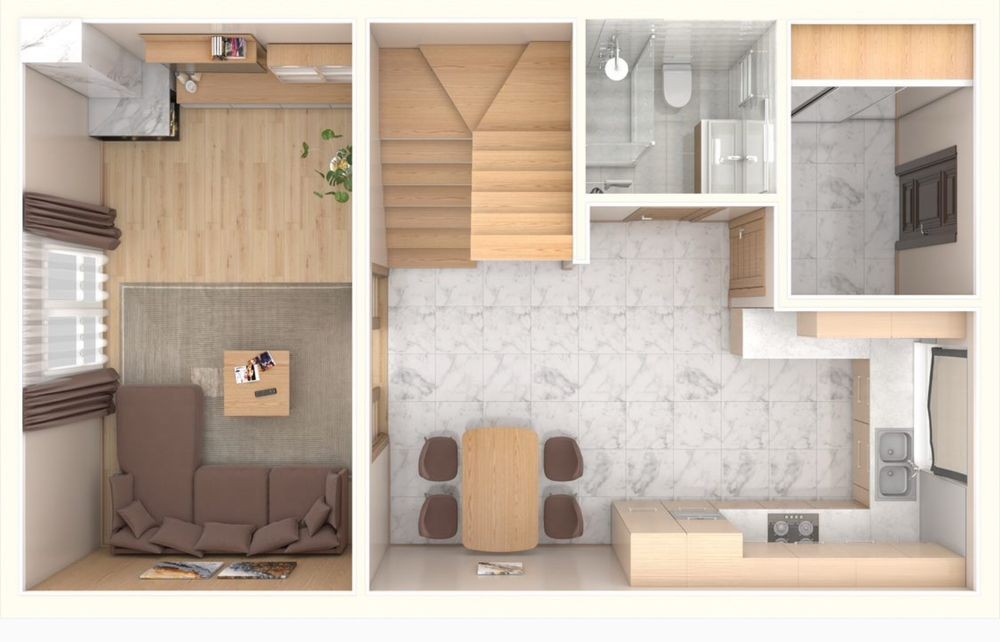 На первом этаже по проекту одна большая комната, кухня и все удобства.