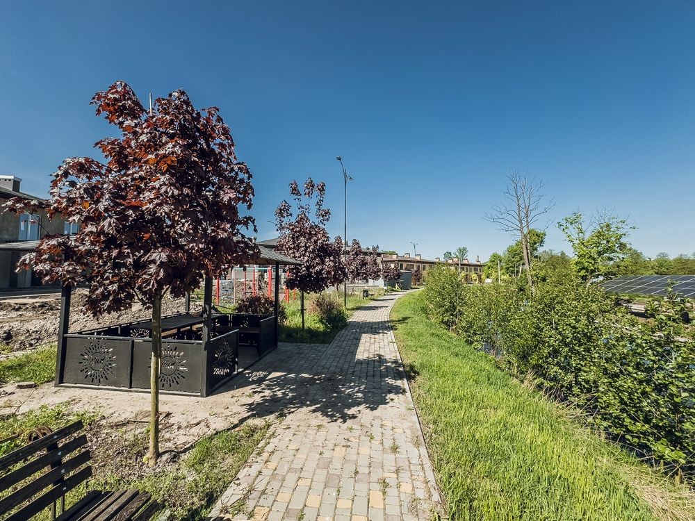 Озеленений двір, власне озеро, бруківка, тротуари, дитячий майданчик, декоративні рослини, розділені внутрішні двори.