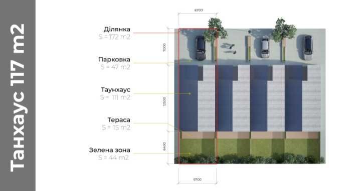 4 таунхауси розташовані на ділянках по 2,45 соток. 12 таунхаусів - на ділянках по 1,6 соток.