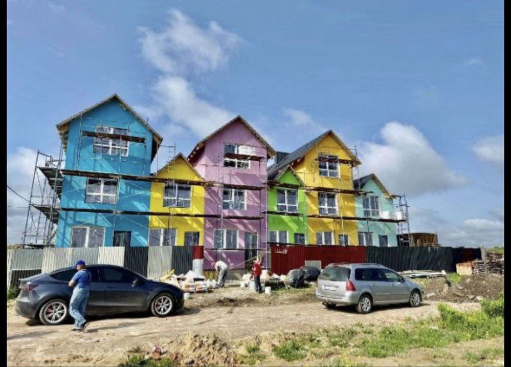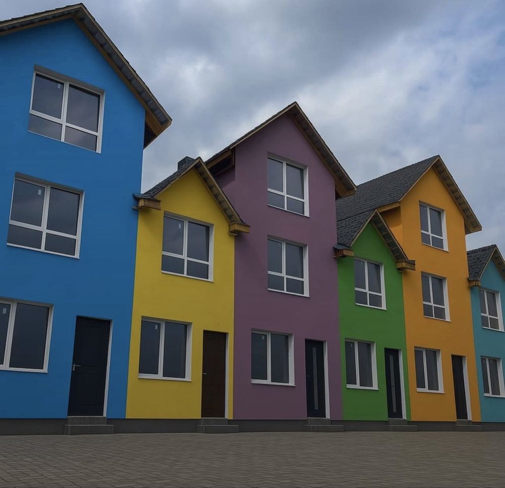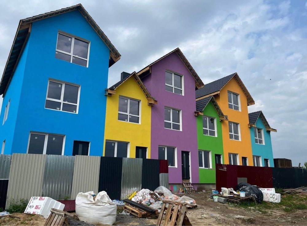 Продам трьохповерховий будинок, на фото - синій. Має три поверхи, кожен поверх 21-22 метри квадратних, будинок боковий, тому має більше вікон ніж у сусідніх та більшу територію.
