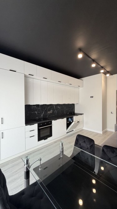 Сучасна кухня у глянці + чорна робоча зона під камінь, трекове освітлення, акуратний “дорогий” інтер’єр.