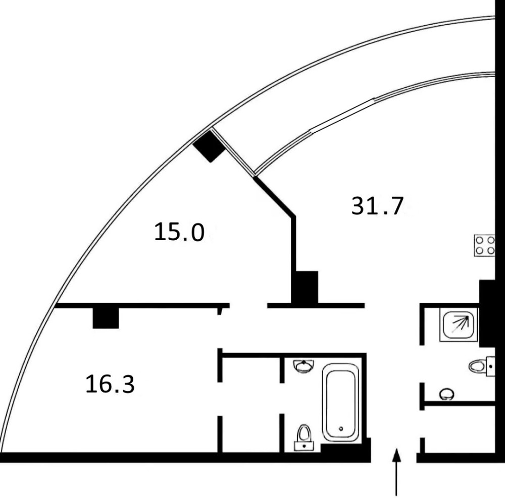 Площа 94 м² – простора кухня-студія (32 м²), дві спальні (15 м² та 16,3 м²).