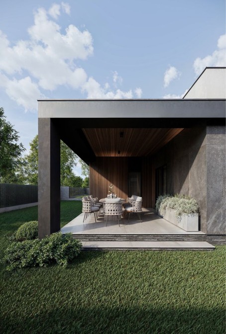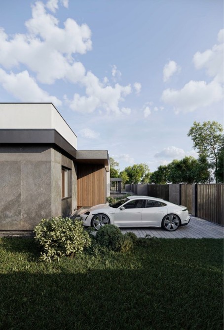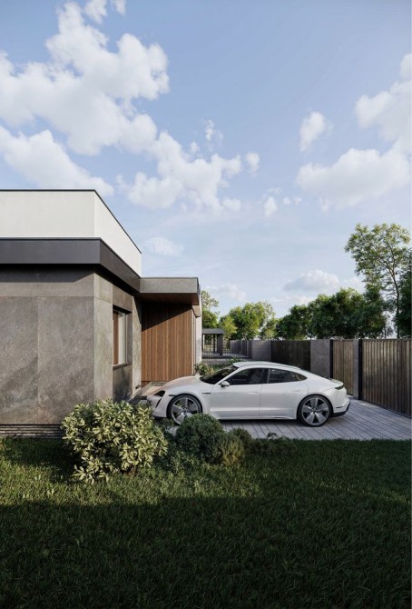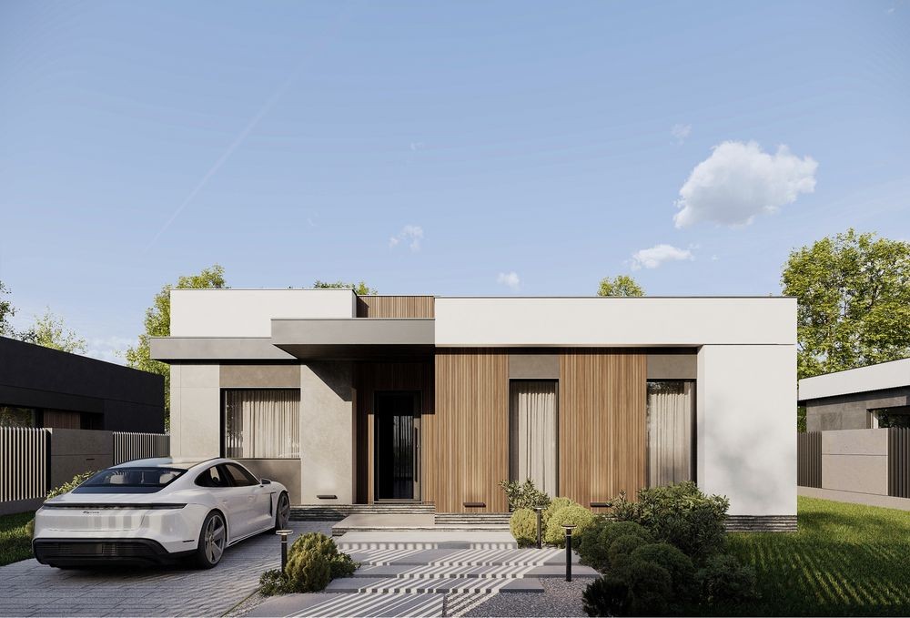 Сучасний фасад у стилі хай-тек — поєднання дерева, керамічних плит та натуральних відтінків. Мінімалізм, лаконічність і функціональність — усе, що потрібно для комфортного життя.
