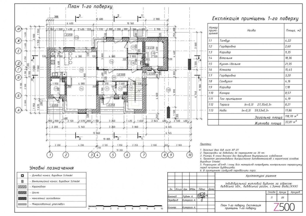 Загальна площа будинку - 260 м2, житлова - 84.04 м2, кухня-їдальня - 21.35 м2. Дві тераси площею 27.35 м2 та 64.76 м2. Підвал - 34.48 м2.
