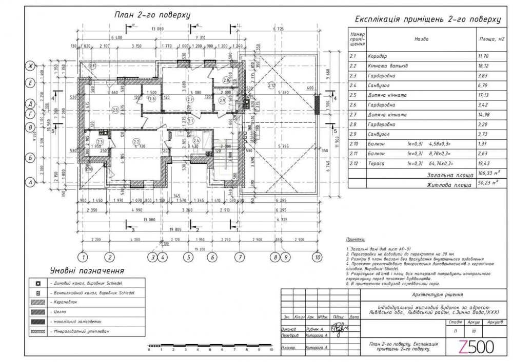 Другий поверх: три спальні кімнати, три гардеробні, коридор, два санвузли, два балкони, відкрита тераса.