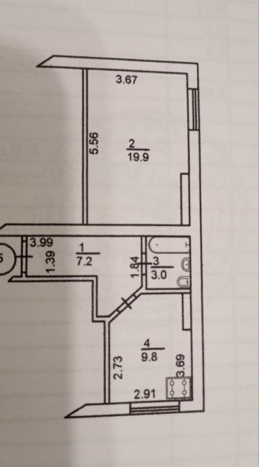 Квартира двостороння- є окрема кімната 19,9 кв.м, в іншій стороні кухня 9,8 кв.м, місткий коридор, санвузол з ванною.
