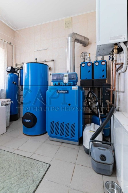 Газовий котел, є електрокотел окремо, очистка води, тепла підлога всюди на першому поверсі, другий - тільки в сан вузлах де кафель, деревяна дошка.