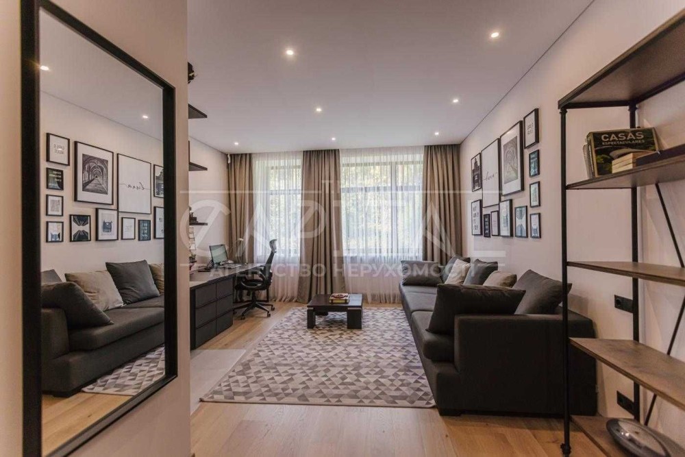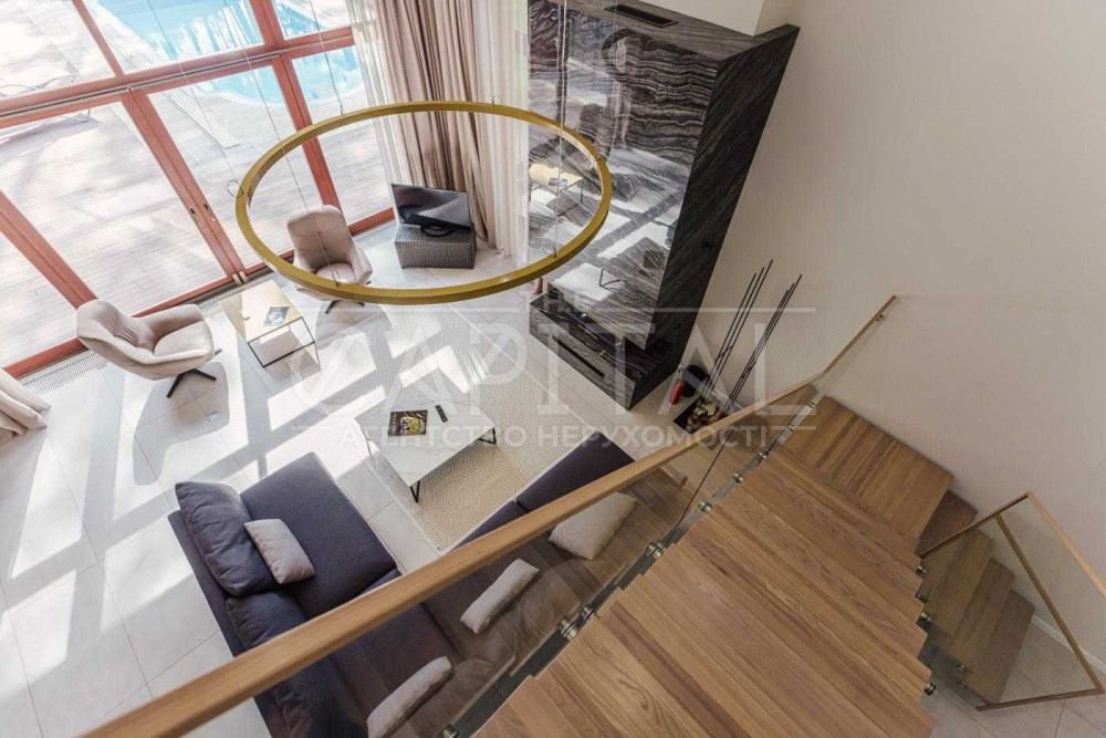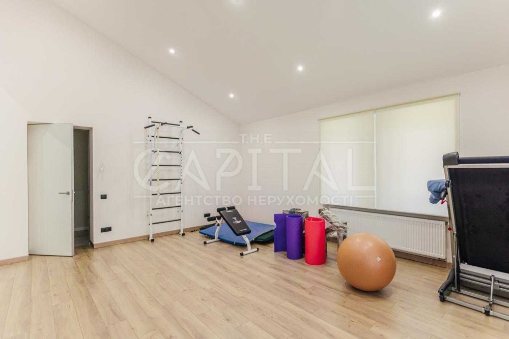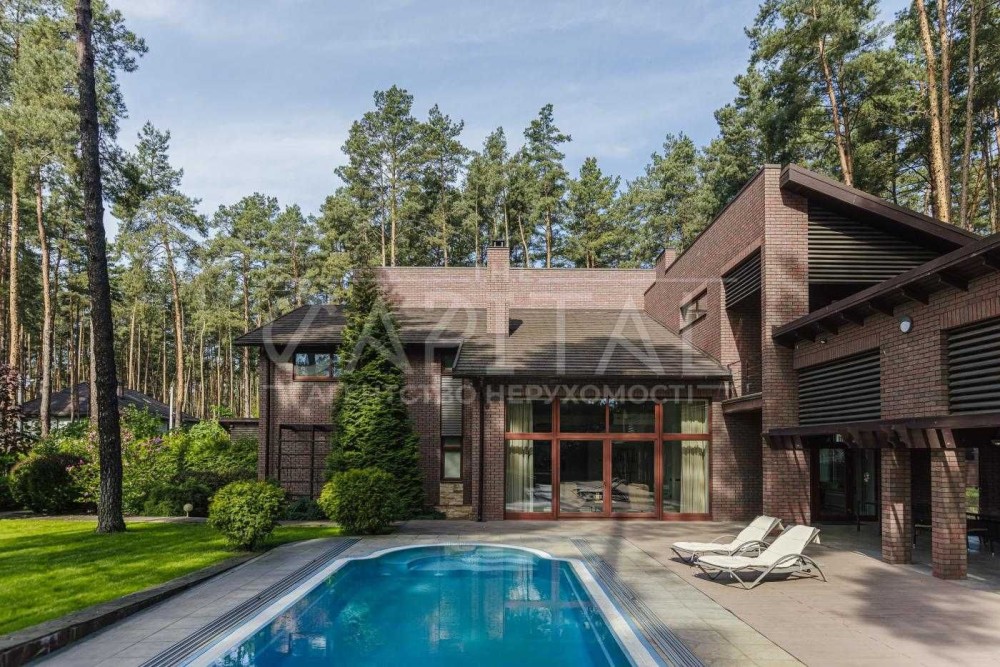 Будинок - 2 пов, площею 500 м2 Вітальня з Каміном, Панорамне скління, Кухня-їдальня, 3 спальні, 6 з/в, Кабінет, Спортзал, Кінотеатр, Тераси, Вуличний басейн 4х12 м, Котельня, господарські та тех. приміщення. Гараж, Підвал, Кімната для персоналу. Спортмайданчик, дитячий майданчик у містечку. Комунікації – водопостачання (свердловина), електрика, газ, септик, супутникове ТБ, Інтернет.