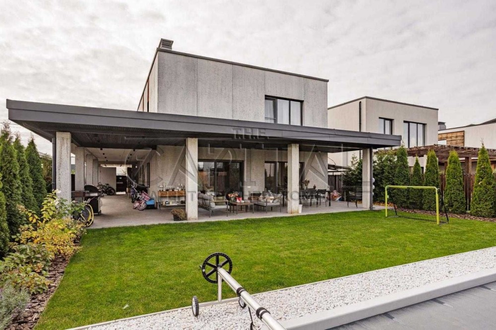 Стильний двоповерховий будинок площею 175 м² з додатковою терасою 90 м² розташований на доглянутій ділянці 5 соток.