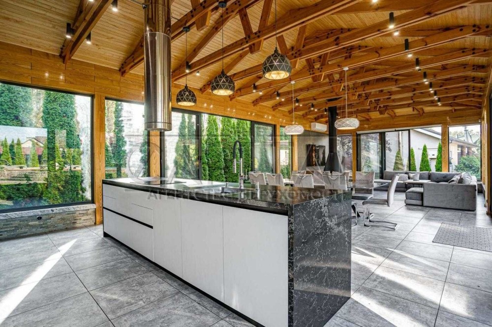 панорамний літній будинок, з повністю обладнаною кухнею, їдальнею та зоною відпочинку з каміном