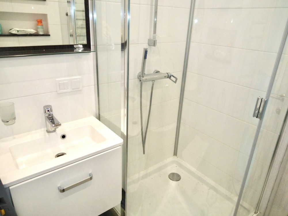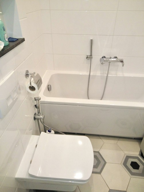 Санузел смежный. Есть и ванна, и душевая кабина. Система очистки воды.