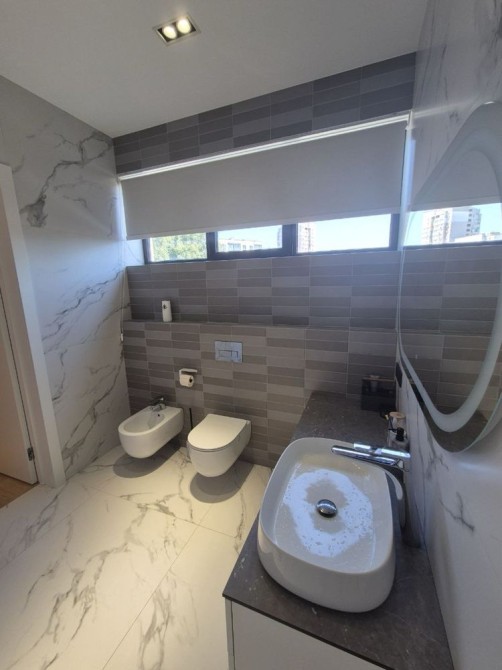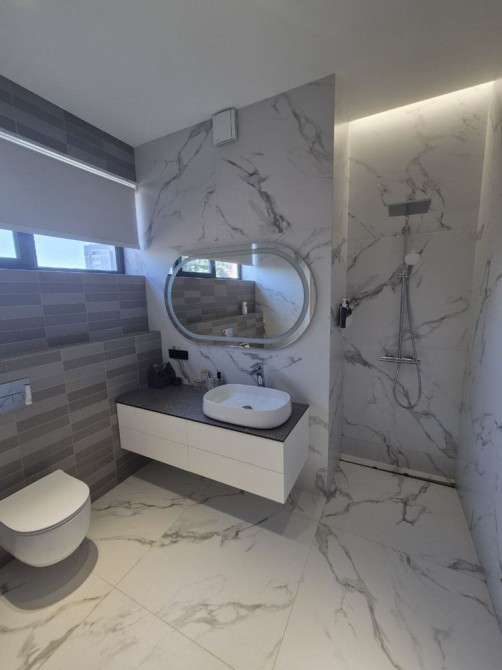 - столешницы в санузлах сделаны под заказ из литого белого экологического пластика и цельного керамогранита L = 1,8 м.;