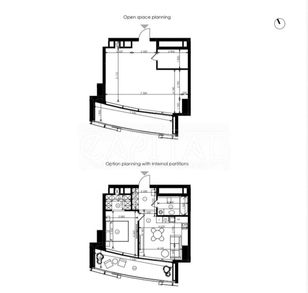 Функціональне планування з можливістю зонування кухні-вітальні та окремої спальні.