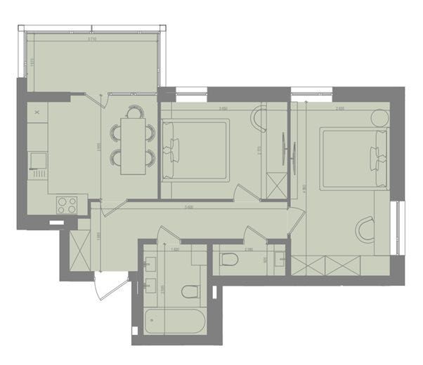 Функціональне планування: окремі спальні та простора кухня-вітальня, що створюють комфортний простір для життя сім’ї або пари.