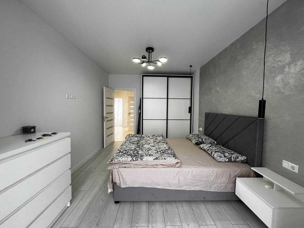 В першій кімнаті знаходиться комод, двоспальне ліжко, шафа купе на всю висоту та приліжкові тумби