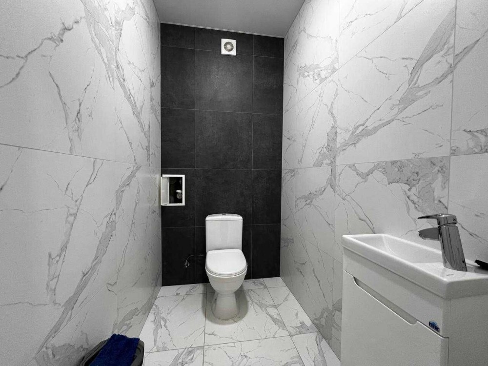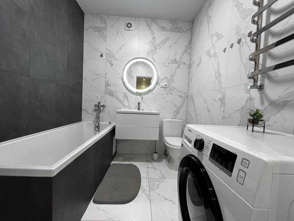 Роздільна ванна кімната з санвузлом ідеально підходить коли проживає велика родина, тут є ванна, дзеркало з лед підсвіткою та пральна машина з рушникосушкою