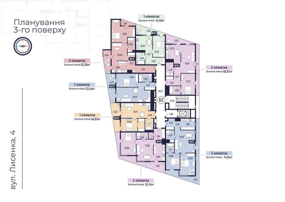 У продажу квартири різної площі — 1-кімнатні, 2-кімнатні та 3-кімнатні.