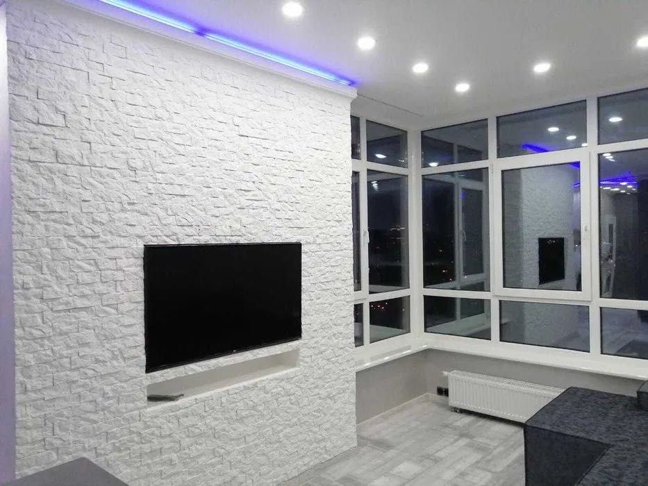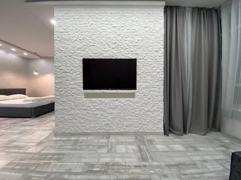 - простора вітальня з диваном, Smart TV та електрокаміном