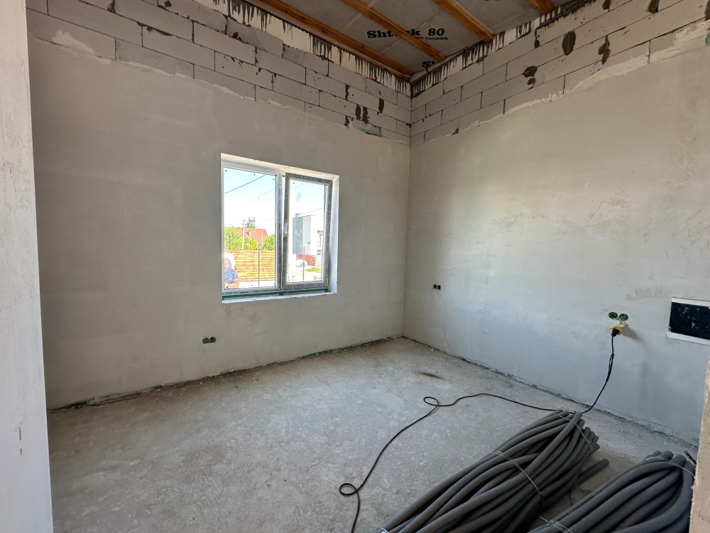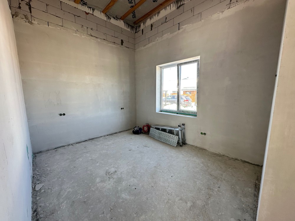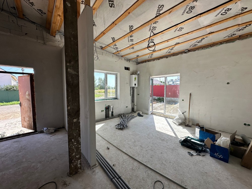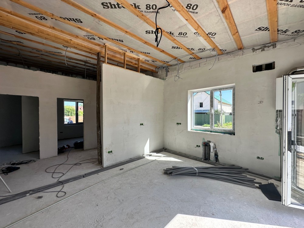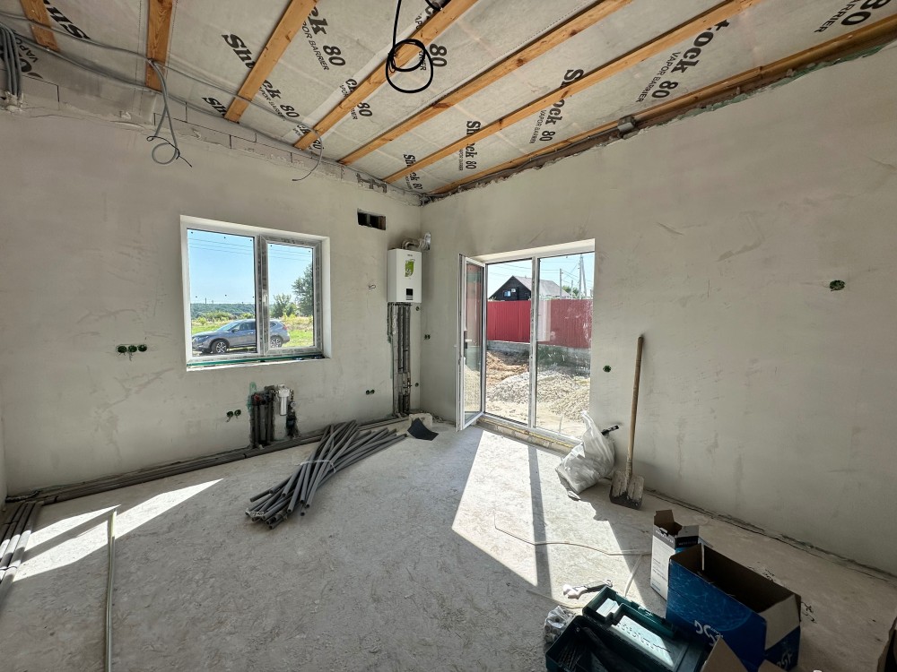 - Готовність до проживання: Встановлено газовий котел, розведено електрику та сантехніку, облаштовано теплу підлогу, виконано гіпсову штукатурку стін та стяжку підлоги.