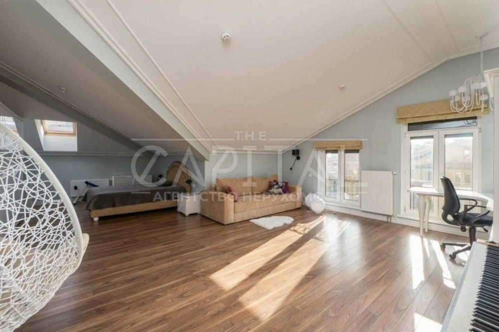 Село Забуччя. 13 км від КП по Житомирській трасі, 19 км від автост.Дачна. 4 км до ЖК Синергія (Ірпінь), 7 км до Бучі. Будинок має 6 кімнат (4 спальні), 2 зали, 4 санвузла, душова. Асфальтований під'Їзд.Будинок під охороною, камери відеоспостереження. Ділянка: Ландшафтний дизайн,басейн, автополив. Відкрита тераса з барбекю. Будинок має мансарду та цокольний поверх. На першому- хол та кухня-студіо, санвузол, туалет та гараж 35 кв.м.. На другому спальня та двоповерховий кабінет, який можно облаштувати під спальню. На третьому кабінет, спальня з санвузлом. Останній поверх- мансарда з санвузлом. На цокольному поверсі велика кімната( під спортзал)де є бігова доріжка, пральна, сауна,душова, техприміщення та 2 кімнати-кладові. На другому поверсі відкрита велика тераса, на третьому балкон. Підлога, керамограніт, плитка, ламінат. Газове опалення, підігрів підлоги на декількох поверхах. камін, сауна. 3 кондіціонера, газовий котел та електроболер. Інтернет оптоволокно.