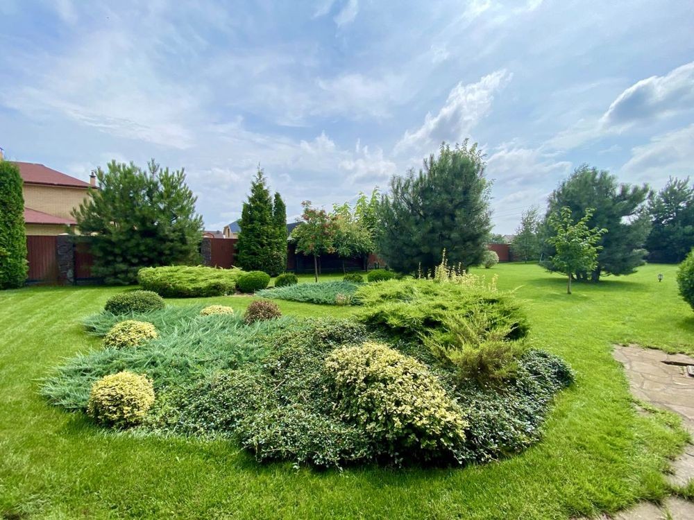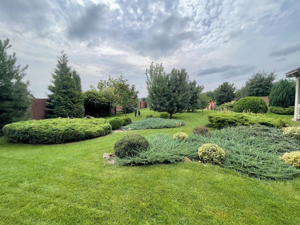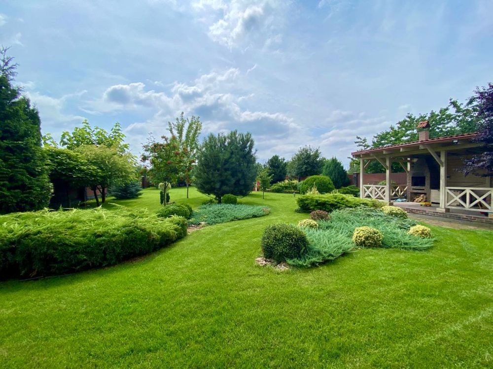 Обійшовши будинок, потрапляємо на задній двір, і тут можна залишитись надовго, краса ландшафтного дизайну вражає - зелений газон, різноманітні дорослі декоративні дерева, доглянуті плодові дерева. Окрема крита альтанка з мангалом і світлом в середині, стане ще однією зоною відпочинку.