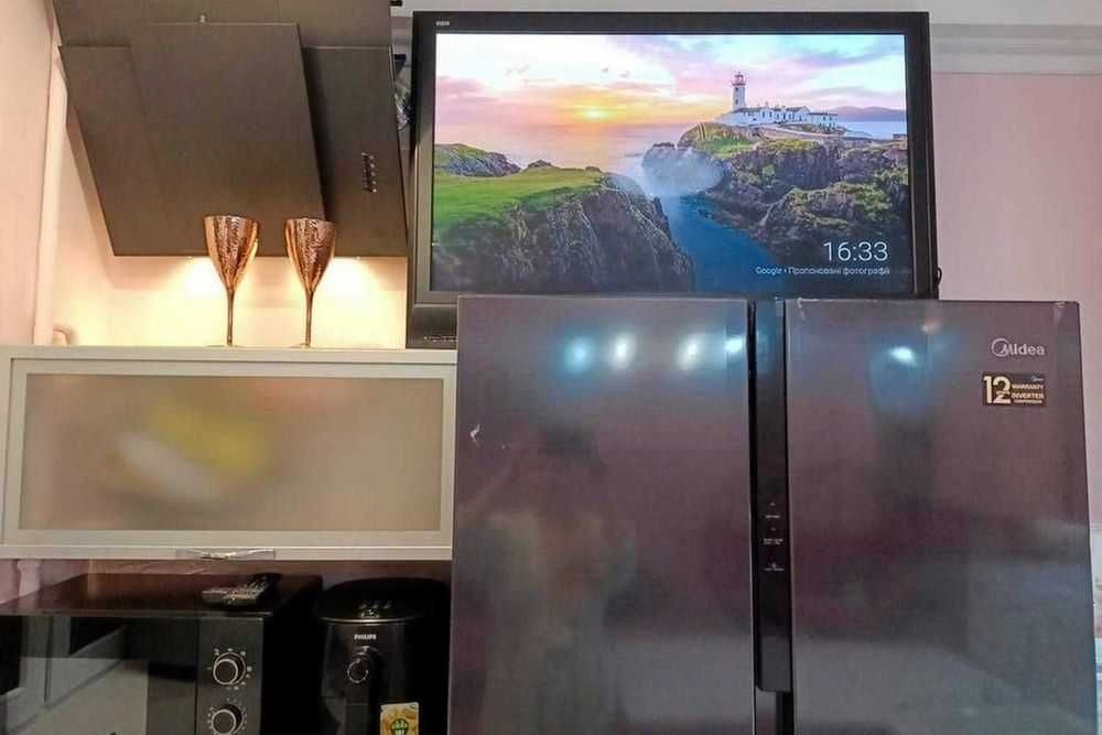большой ТВ в зале + смарт-ТВ в спальне, Wi-Fi, графический монитор.