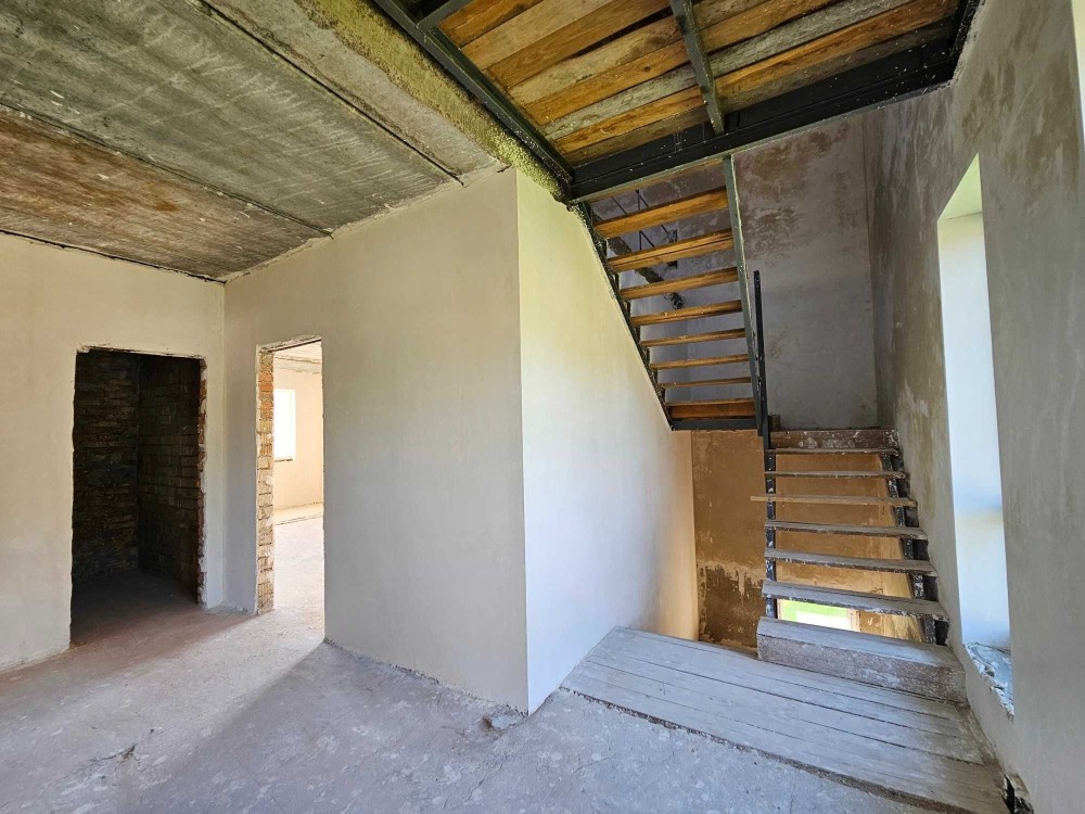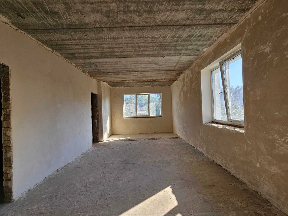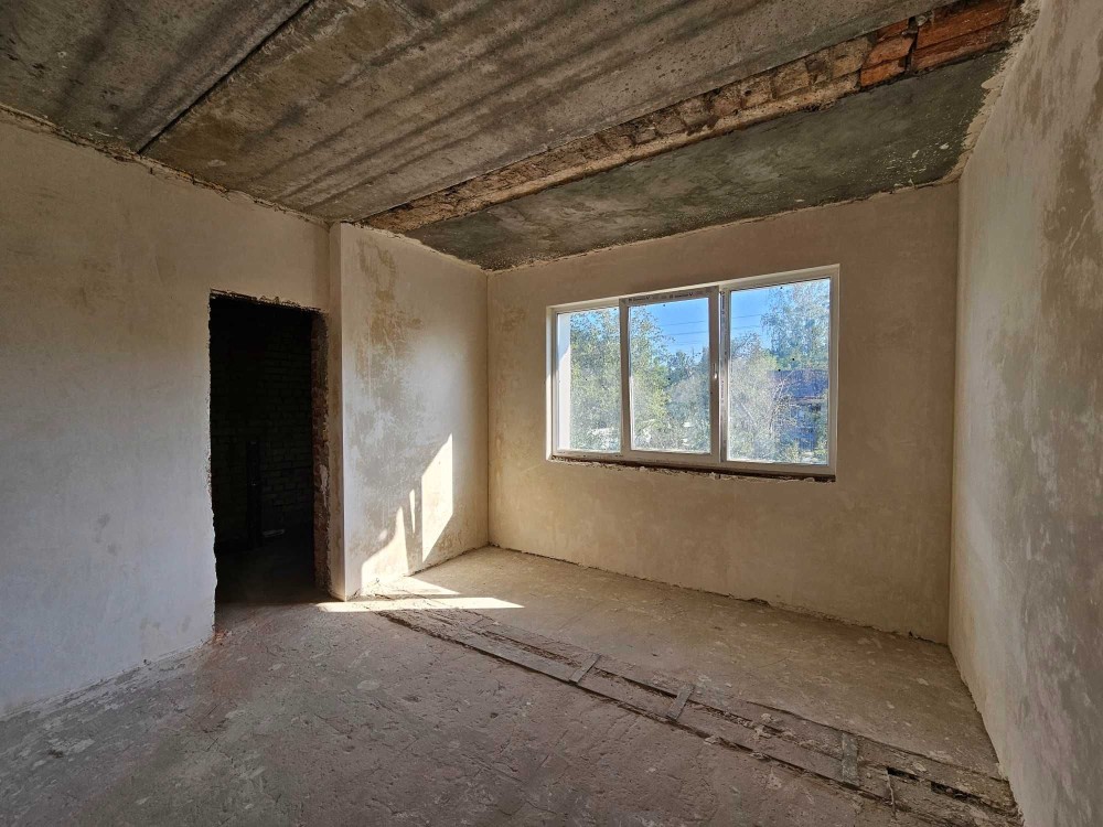 Продається новий індивідуальний житловий будинок котеджного типу загальною площею 131 м.кв. під чистове оздоблення, розташований в селі Крячки Фастівського (колишнього Васильківського) району Київської області на території нового житлового масиву із сучасною котеджною забудовою, що перебуває на відстані 20 км від станції метро «Теремки» міста Києва та за 1,5 км від міста Васильків. Житловий будинок складається з першого та мансардного поверхів. Загальна площа будинку із допоміжними спорудами становить 173,1 м.кв., з яких: а) площа будинку ‒ 131,0 м.кв., у тому числі житлова (основна) ‒ 94,1 м.кв. та допоміжна (підсобна) ‒ 39,6 м.кв.; б) площа тераси – 23,1 м.кв.; в) площа трьох балконів – 13,4 м.кв. (5,8 + 4,9 +2,7 м.кв.); площа ґанку – 5,6 м.кв. Котедж вміщує в собі 5 (п’ять) доволі просторих кімнат, 2 (два) санвузли (на кожному із поверхів), 1 (одне) технічне приміщення (котельня або бойлерна), 2 (два) коридори, 1 (одну) вітальню із виділеною еркером обідньою зоною, що поєднана з кухнею. Із вітальні є окремий вихід на велику терасу, з якої відкривається затишний вигляд на внутрішній двір. Кожна з трьох мансардних кімнат має окремий вихід на балкон. Над усією площею мансардного поверху розташоване містке горищне приміщення. Будинок приєднаний до електропостачання потужністю ‒ 12кВт (3 окремих фази). Має свердловину глибиною 55 метрів із фактичним дебітом (спроможною потужністю) ‒ 2,5 м.куб./год. та каналізацію септик з переливом на 11 м.куб. На усій площі першого (крім житлової кімнати) та у санвузлі мансардного поверхів встановлена система водяної теплої підлоги фірми «Rehau». По котеджу розведені: опалення, водопостачання і каналізація. В будинку передбачена можливість встановлення камінної топки, а також приєднання котеджу до газорозподільної мережі та всесвітньої мережі Інтернет. Індивідуальний житловий будинок розташований на земельній ділянці площею 0,075га з цільовим призначенням – (02.01) для будівництва і обслуговування житлового будинку, господарських будівель і споруд (присадибна ділянка). Під житловою забудовою перебуває 0,0115га земельної ділянки, решта 0,0635га займає просторий двір. Кадастровий номер земельної ділянки: 3221487004:03:006:0328. Земельна ділянка огороджена парканом із монолітного фундаменту, що опорядковане металевим штахетом із обох боків та металевим профілем з тильної та фасадної сторін. Заїзд у двір має відкатні ворота. На території двору (перед будинком) облаштоване загальне паркомісце на 2 (два) автомобіля, решта двору засіяне газонною травою. Котедж побудований з якісних матеріалів за проектом європейського архітектурного бюро. Так, фундамент, перекриття та міжповерхові сходи ‒ монолітні. Стіни будинку збудовані з газоблоку AEROC D500 (товщиною 300мм), що утеплений пінопластом 100мм. Внутрішні міжкімнатні перегородки виконані із цегли. Дах ‒ металочерепиця фірми «Ruukki», що утеплений мінераловатними плитами загальною товщиною 200мм. Вікна вироблені з профілю фірми «Rehau» серії EVRO 70. Фасад котеджу покритий акриловою штукатуркою. Будинок за усім периметром має вимощення шириною 0,9 метри, що облаштоване фігурними елементами мощення (ФЕМ). Зручне ергономічне планування будинку, а також наявність високих стель обох поверхів дає можливість відчувати себе вільно і затишно. Завдяки правильному утепленню зовнішніх стін будинку, у ньому прохолодно влітку та тепло вз