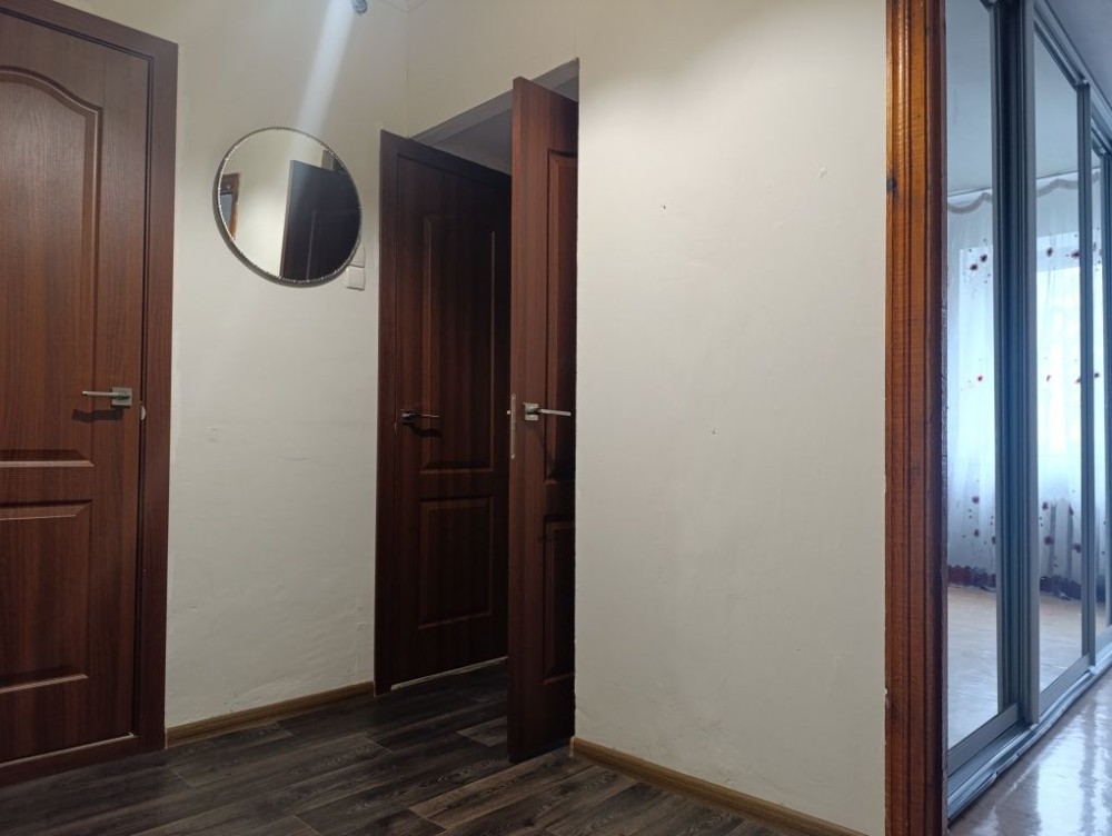 Расположена на 2-м этаже , 16-ти этажного дома. Два лифта. Тамбор закрывается. Брльша 40 кв.м. Два больших балкона лоджии застеклены. Сан узел раздельный. Просторная прихожая . Огромный зеркальный шкаф куппе на всю стену.