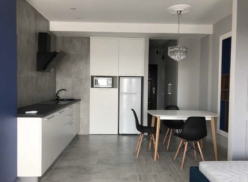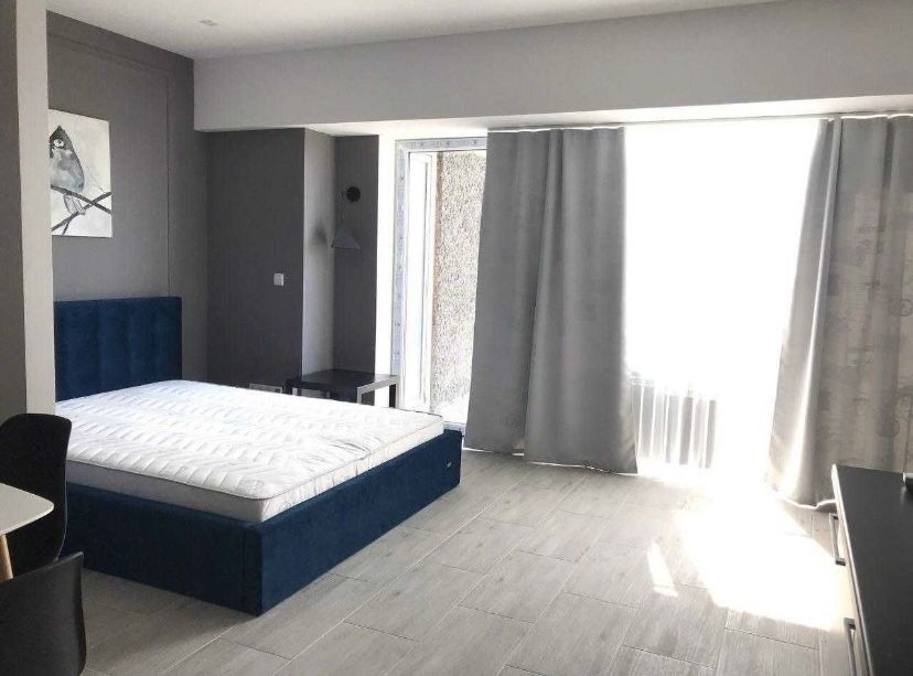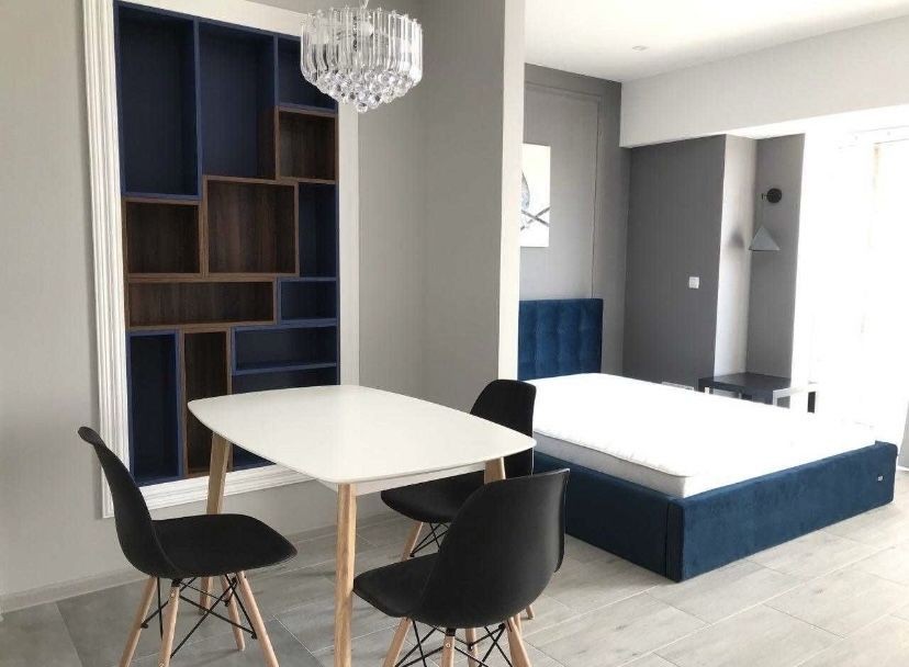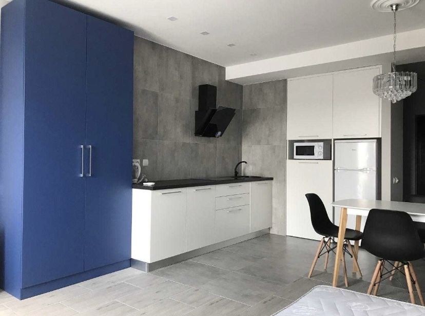 Планировка кухня-студия + санузел, с дизайнерским ремонтом, с необходимой мебелью и техникой. Теплые полы. Сигнализация.