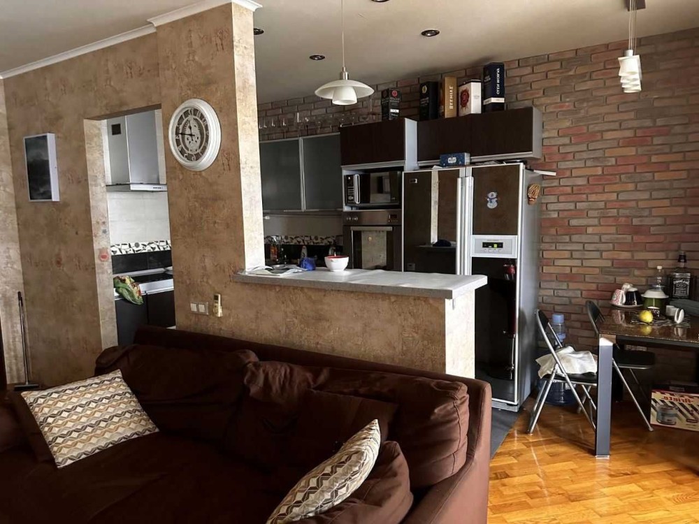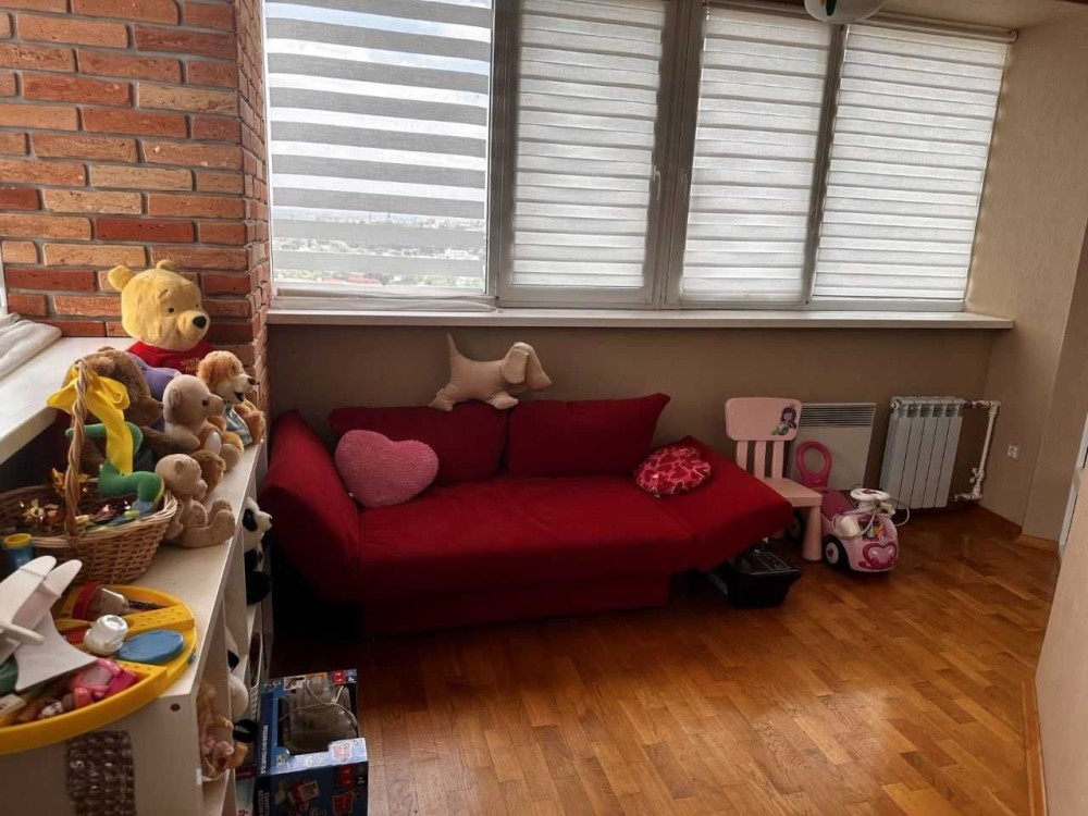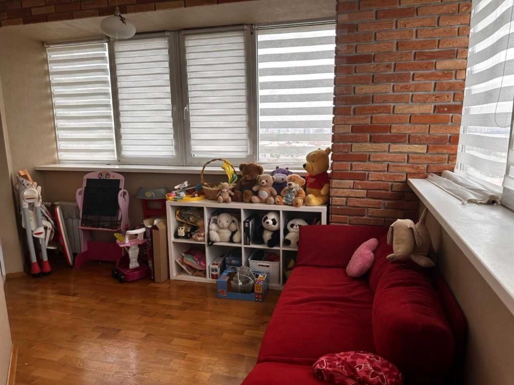Состоит из большой спальной комнаты , кухни-гостинной , а так же , на большой лоджии расположилась детская комната .