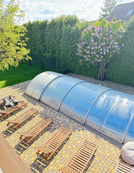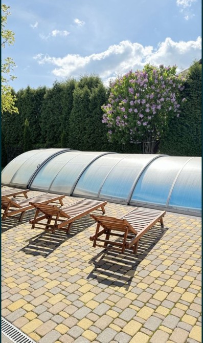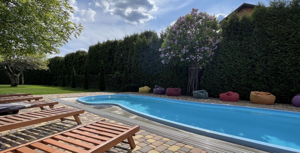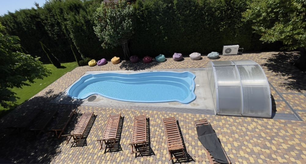 Басейн 10 на 3 метри з протитоком , можна плисти на місці . Закривається куполом. Працює з травня по вересень включно. Шезлонги біля басейну .