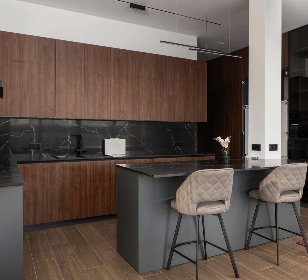 простора кухня-обідня зона, об’єднана з вітальнею, з виходом на терасу біля води.