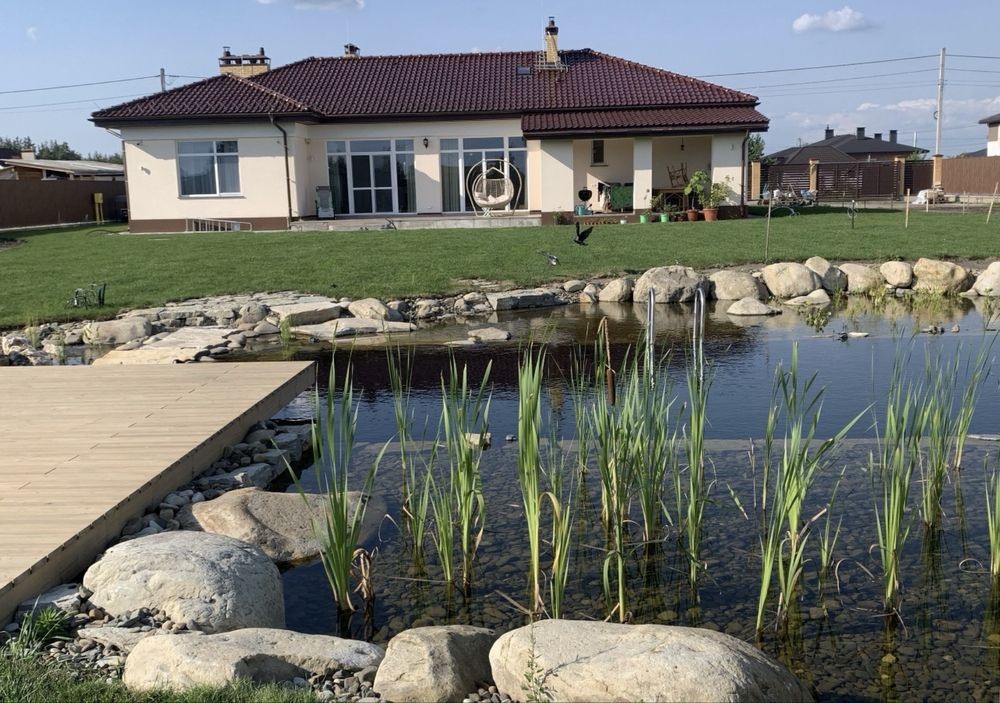 Здається в довгострокову оренду одноповерховий будинок з панорамними вікнами та власним еко озером, з плавальною зоною .