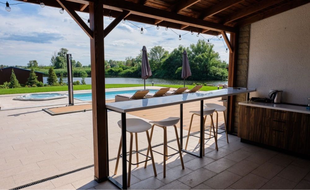Тераса біля басейну обладнана 4-ма шезлонгами, парасольками, лаунж-зоною з зручним диваном і кріслами, барним столом.