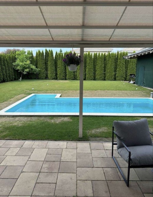 Будинок розташований на приватній ділянці площею 9 соток. Є басейн із підігрівом, газон. Будинок повністю готовий для проживання.