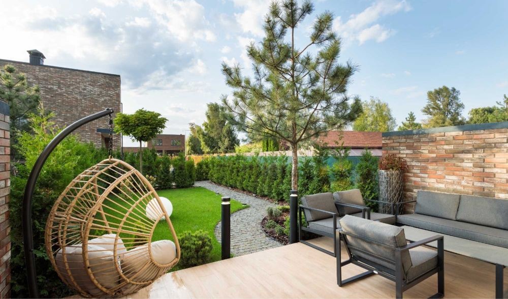 Задній двір з ландшафтним дизайном облаштований системою автоматичного поливу, двома терасами, автоматичною маркізою.